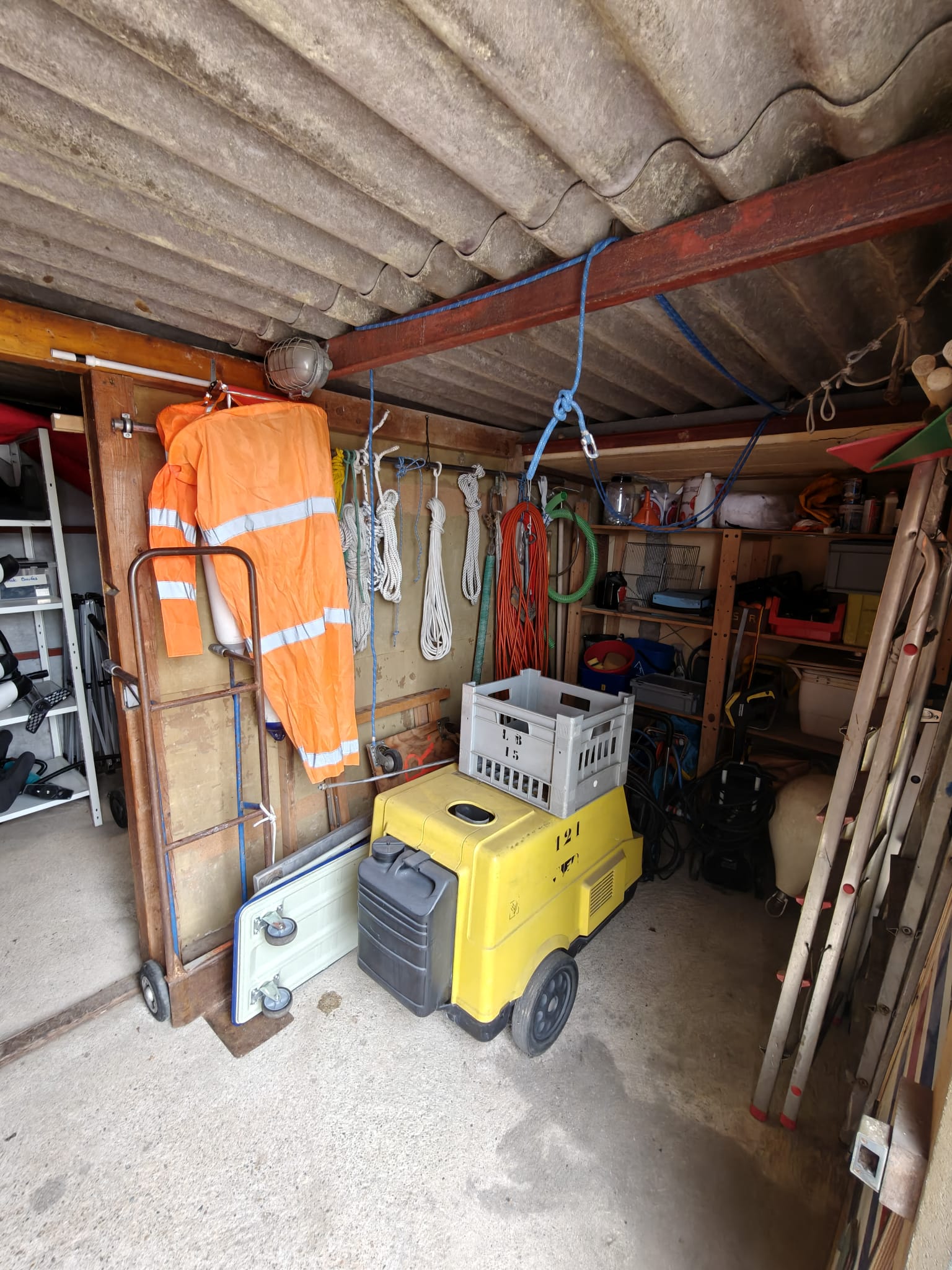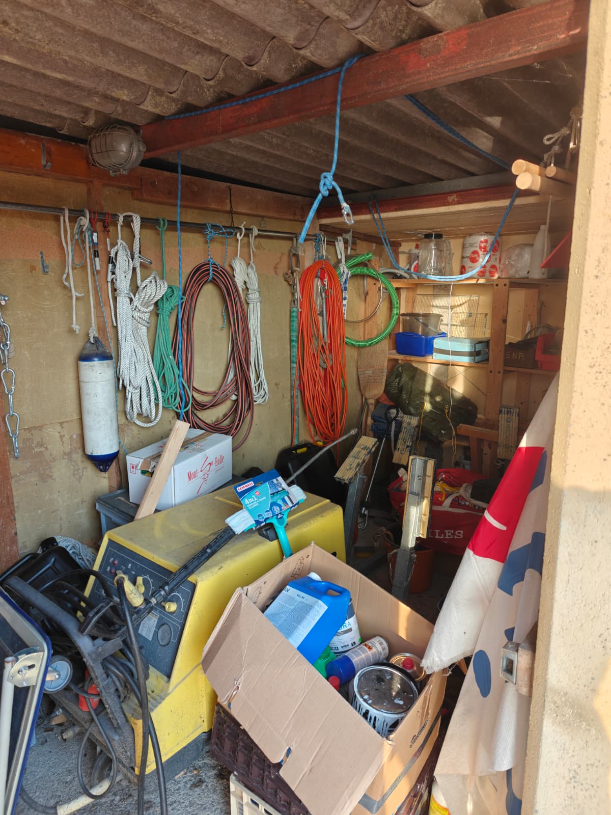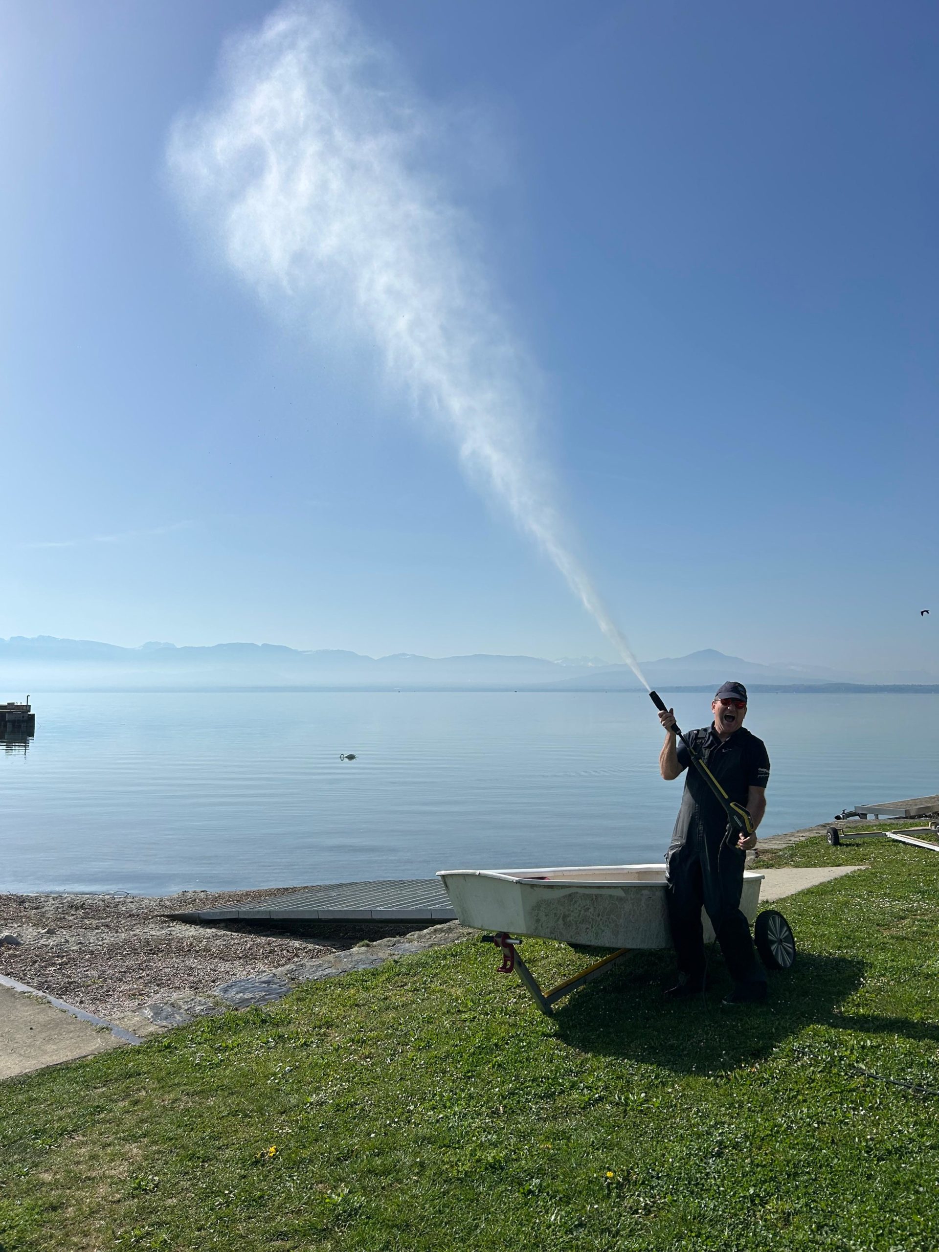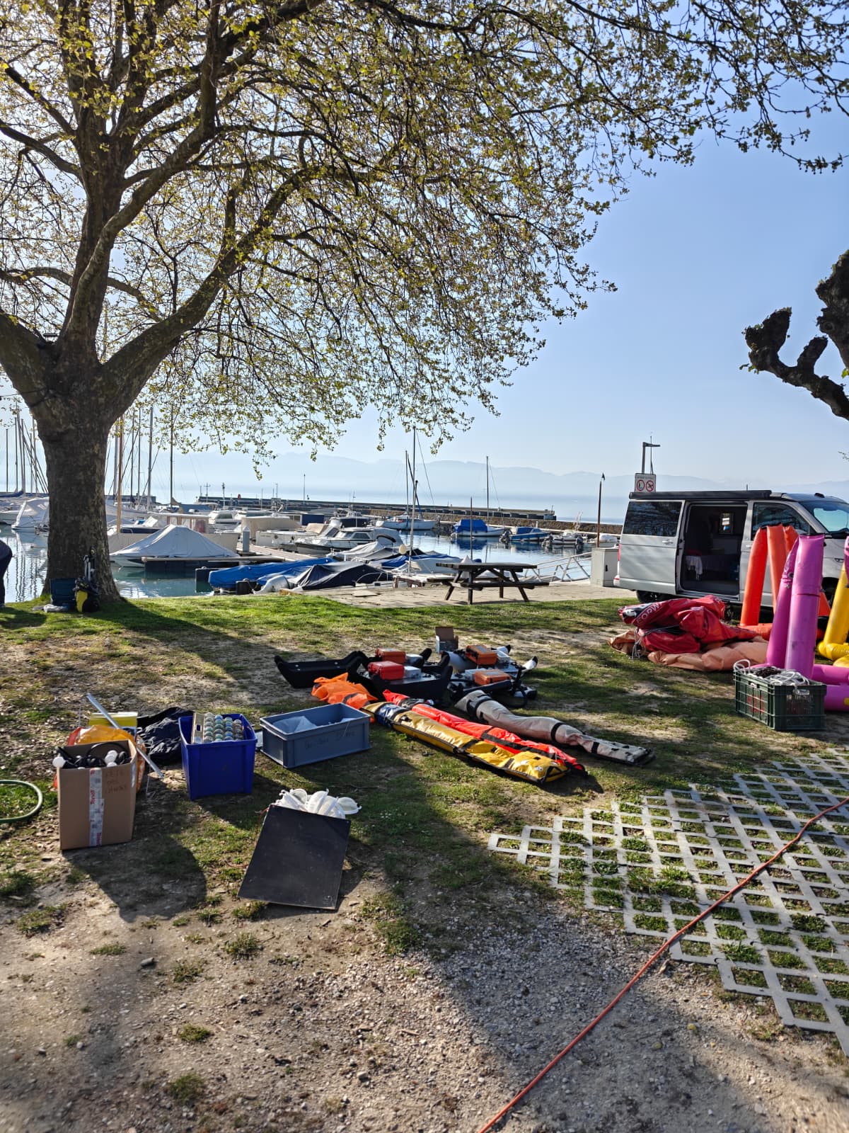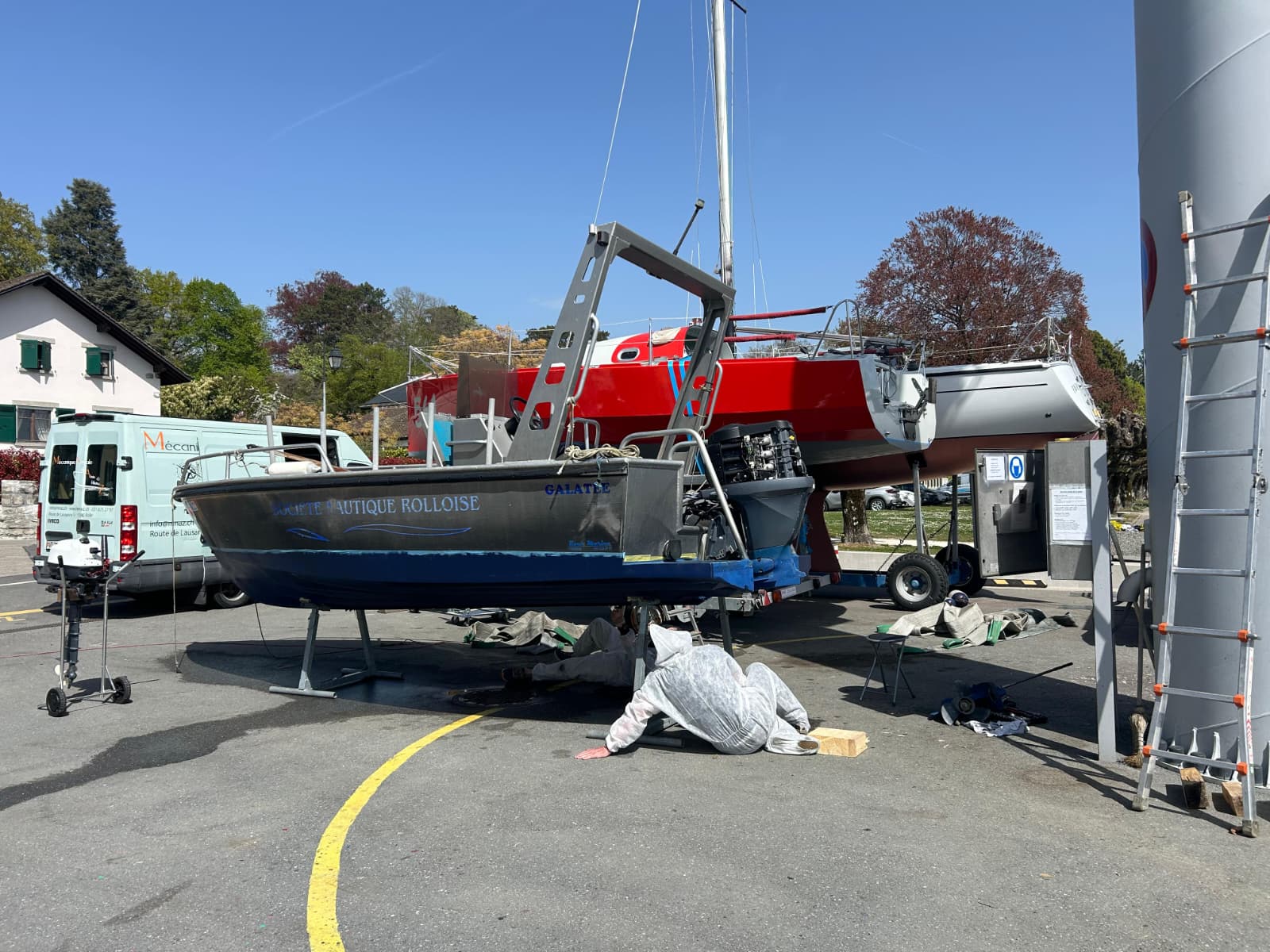 Après un café-croissant au soleil, Maxence, notre responsable matériel, a briefé l’équipe. La mission ? Balayer, karchériser, frotter, appliquer de l’anti-fouling, gonfler les bouées, poncer, peindre… Les forçats ont enchaîné les tâches avec énergie et bonne humeur.